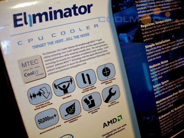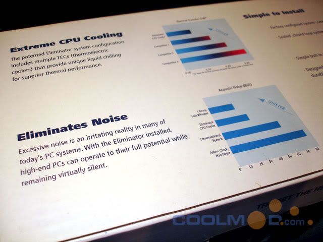 En cuanto al eliminator, su competidor directo tanto por facilidad de instalación, como por precio y toque "geek" es el swiftech h20-120 compact, a ver como se porta contra el disipador or aire.