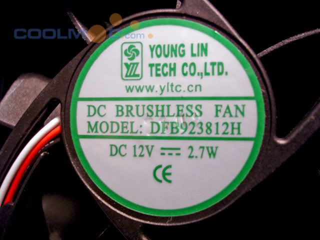 En la imagen de detalle del estator nos encontramos con la pegatina típica donde aparece el fabricante del ventilador en este caso Young Lin Tech Co.,LTD y la inscripción de modelo del mismo DFB923812H y sus especificaciones básicas de alimentación y consumo en este caso DC 12 V y 2,7 W de consumo.