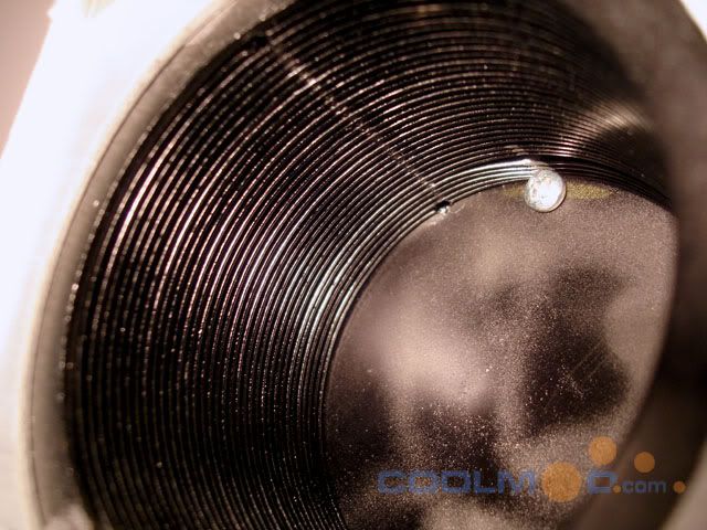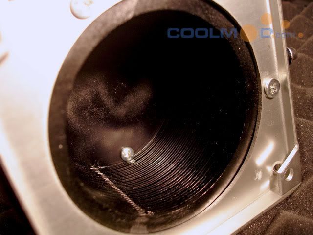 Una vez retirado el ventilador podemos ver cual es el diseño empleado por Coolit para poder retirar el calor de las peltiers, como vemos el Eliminator cuenta con un disipador en aluminio anodizado en forma cilíndrica con el perímetro completamente laminado.