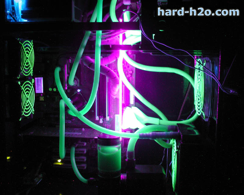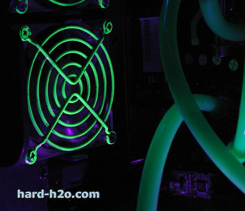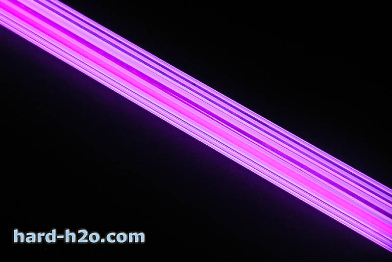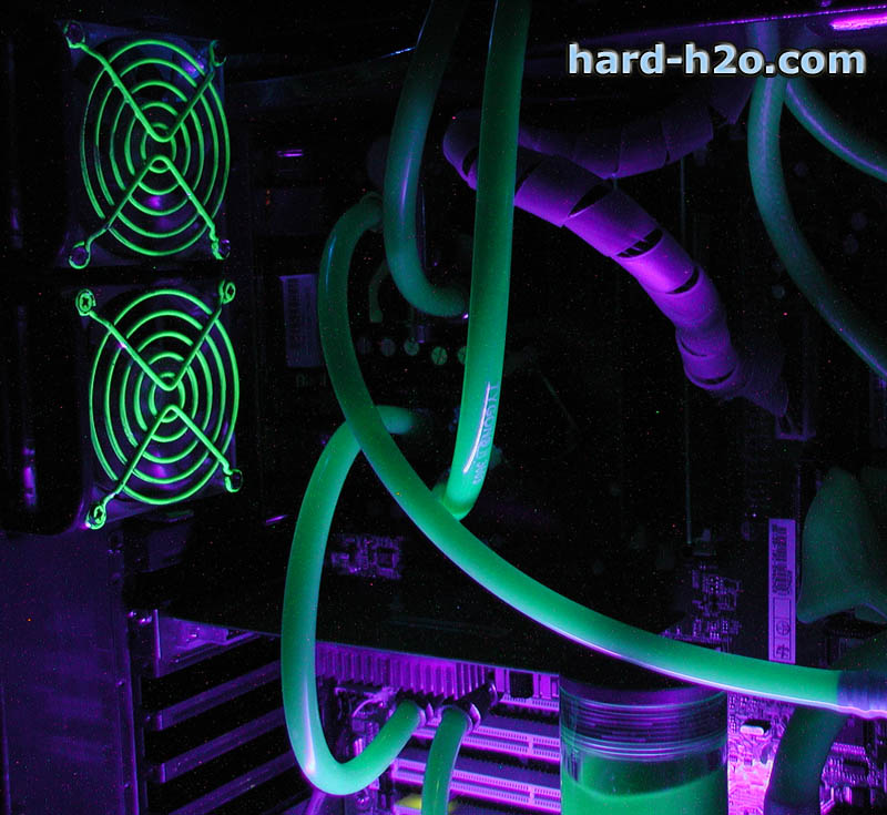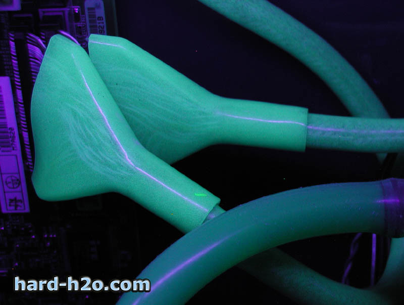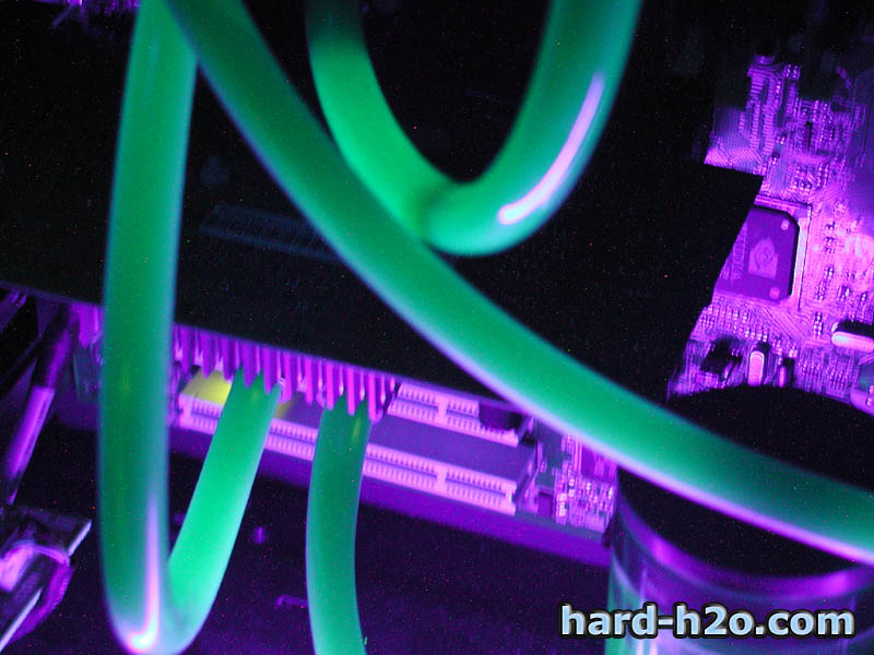 | Detalle de las tubos de nuestro sistema de refrigeración líquida con líquido reactivo UV. | Y un primer plano de los tubosr. |