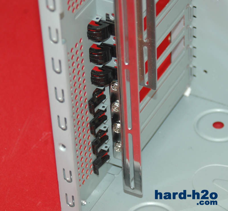 | Vista principal del rail. Como se observa, es un producto muy fácil y es un producto muy funcional, cuya principal limitación es la propia imaginación del usuario. | La instalación es muy sencilla aunque en el paquete no vienen instrucciones ninguna y al principio puede ser algo engorroso o lioso, pero no más lejos de la realidad. En cuanto le demos un par de pasadas, se monta con total facilidad. Aquí veis los 4 orificios que van como sujeción del rail principal a las bahías PCI. |