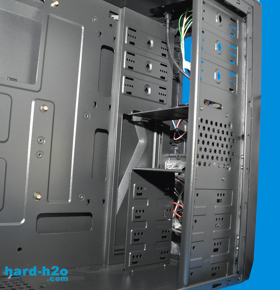 La zona frontal cuenta con tres bahías de 5,25 pulgadas con apertura fácil gracias a los clips de color rojo. Los embellecedores de las bahías cuentan con una placa microperforada para evitar la entrada masiva de polvo.