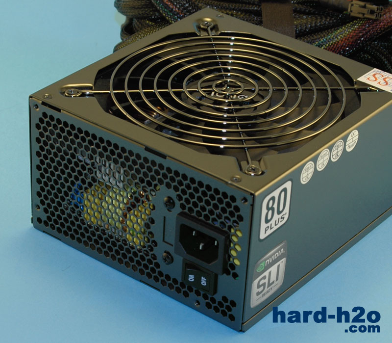 Pruebas realizadas: El equipo de pruebas descrito anteriormente corresponde a la carga a la que se somete la fuente en la modalidad de carga (full). Se simula mediante una serie de cargas resistivas conectadas a los enchufes de la fuente forzando sobre todo la línea de +12V. Para el estado idle se ha tomado una potencia fija de 106 W. El equipo de pruebas descrito facilita de esta forma la comparación de las pruebas con un equipo real de elevada potencia. Se ha dejado funcionando el sistema durante un mínimo de media hora para que todos los componentes y sobre todo la fuente alcance su temperatura normal de funcionamiento, luego se han tomado los valores con un multímetro digital directamente en el enchufe de la placa base, mediciones que se han tomado tanto en reposo (idle) como con carga (full). Para averiguar el consumo eléctrico del equipo así como el factor de potencia hemos usado un aparato medidor de energía que se enchufa en serie a la toma de corriente de la fuente. El nivel sonoro que emite la fuente se indica de forma subjetiva del analizador, habiendo sido la temperatura del entorno de 18º C. Las líneas de 3,3V y 5V apenas muestran variaciones durante las pruebas, sí habiendo algo de caída en la de 12V según aumentando las cargas, algo relativamente normal ya que la mayoría de las cargas cuelgan de éste voltaje. Con la carga pequeña de 106 W obtuvimos una tensión de 12,67 V que está 5,5 % por encima de la referencia, valor sin mayor importancia que realmente nos dice que esta fuente está diseñada para cargas elevadas. Por lo tanto con las carga de 345 W y la de 620 W las tolerancias siguen siendo positivas reduciéndose a un 2,3 y un 1 %, respectivamente. El PFC activo ha situado el factor de potencia en un valor medio del 85 % con la carga baja, y con valores perfectos del 100 % en las dos cargas superiores. El nivel sonoro nos ha sorprendido positivamente habiendo sido casi inaudible durante todas las pruebas, sin aumentar en ruido incluso con la carga elevada de 620 W, ciertamente impresionante. Esto es posible gracias a la elevada eficiencia superior al 80 % que logra que la fuente genere muy poco calor, y al gran ventilador de 13,5 cm que evita tener que montar un sistema de refrigeración ruidoso aún moviendo una cantidad grande de aire. Las temperaturas de evacuación de la fuente han sido de 26° C en reposo, 30° C con la carga mediana y de 33° C con la carga grande. Conclusión: