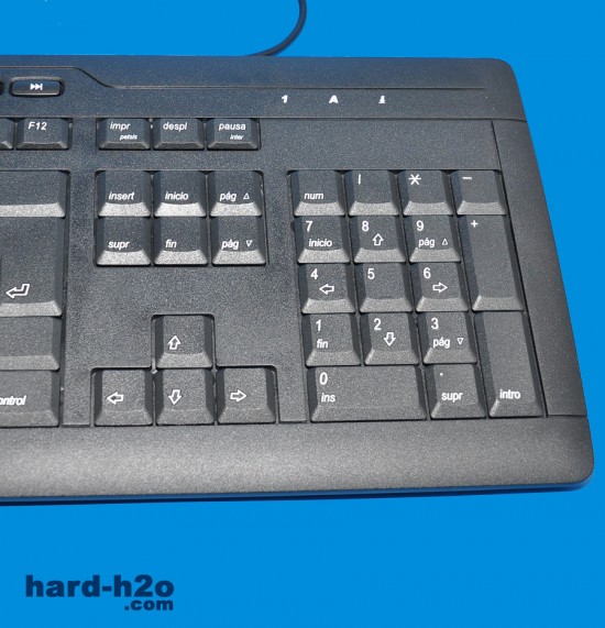La disposición de las teclas, así como del teclado numérico, es idéntico a la mayoría de teclados del mercado. Tenemos además los indicadores en color naranja para el bloqueo de mayúsculas, teclado numérico, etc.