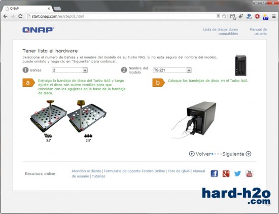 Para localizar el modelo exacto, esta web asistente nos preguntará de cuántas bahías es el NAS y qué modelo; se incluye un pequeño explicativo de su instalación y de los pasos a seguir para arrancarlo.